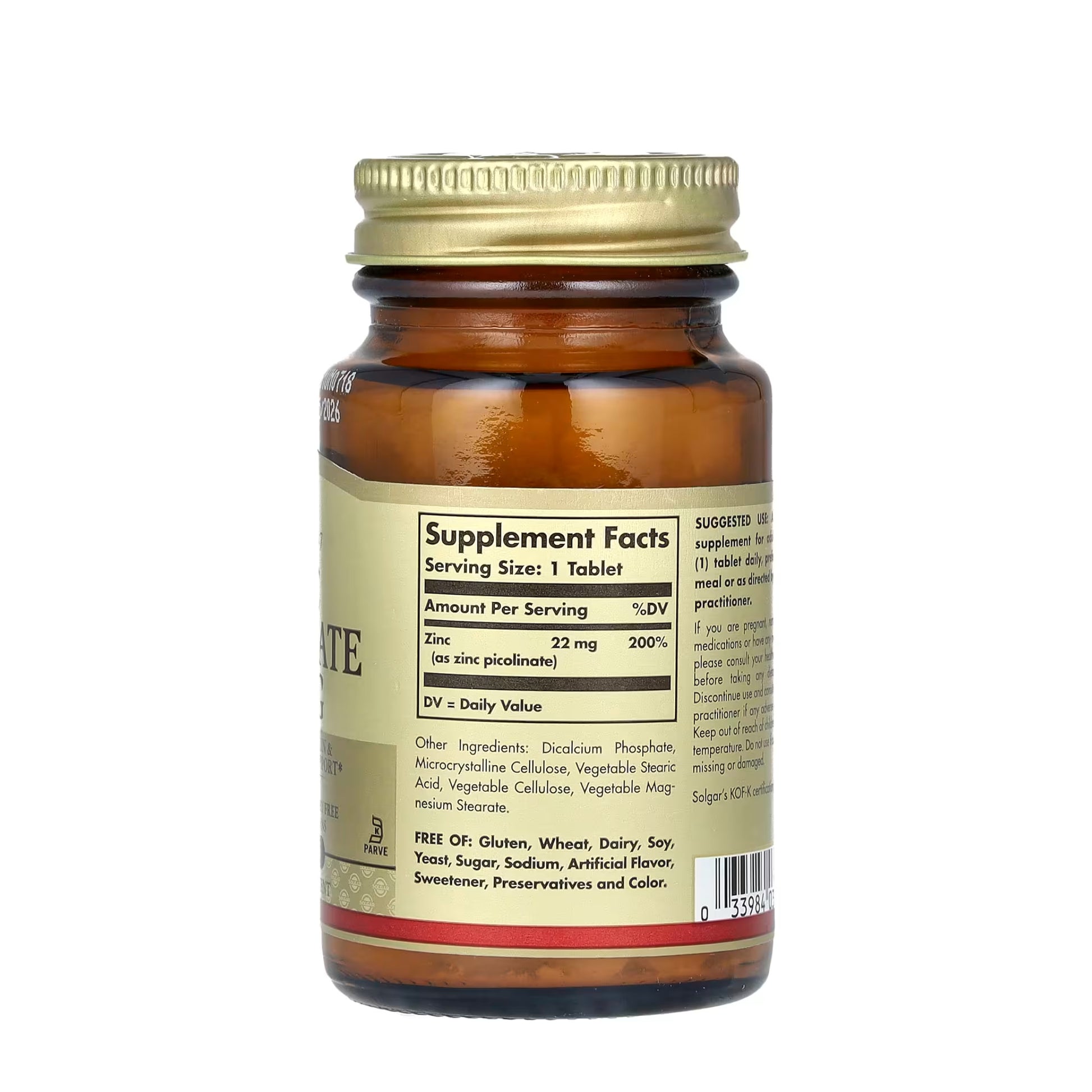 The supplement contains 22 mg of zinc as zinc picolinate in each tablet, formulated for maximum absorption. Ingredients include zinc (as zinc picolinate), and the product is free from gluten, wheat, dairy, soy, yeast, sugar, sodium, artificial flavors, sweeteners, preservatives, and artificial colors. Solgar Zinc Picolinate is non-GMO, vegan, gluten-free, and kosher.
